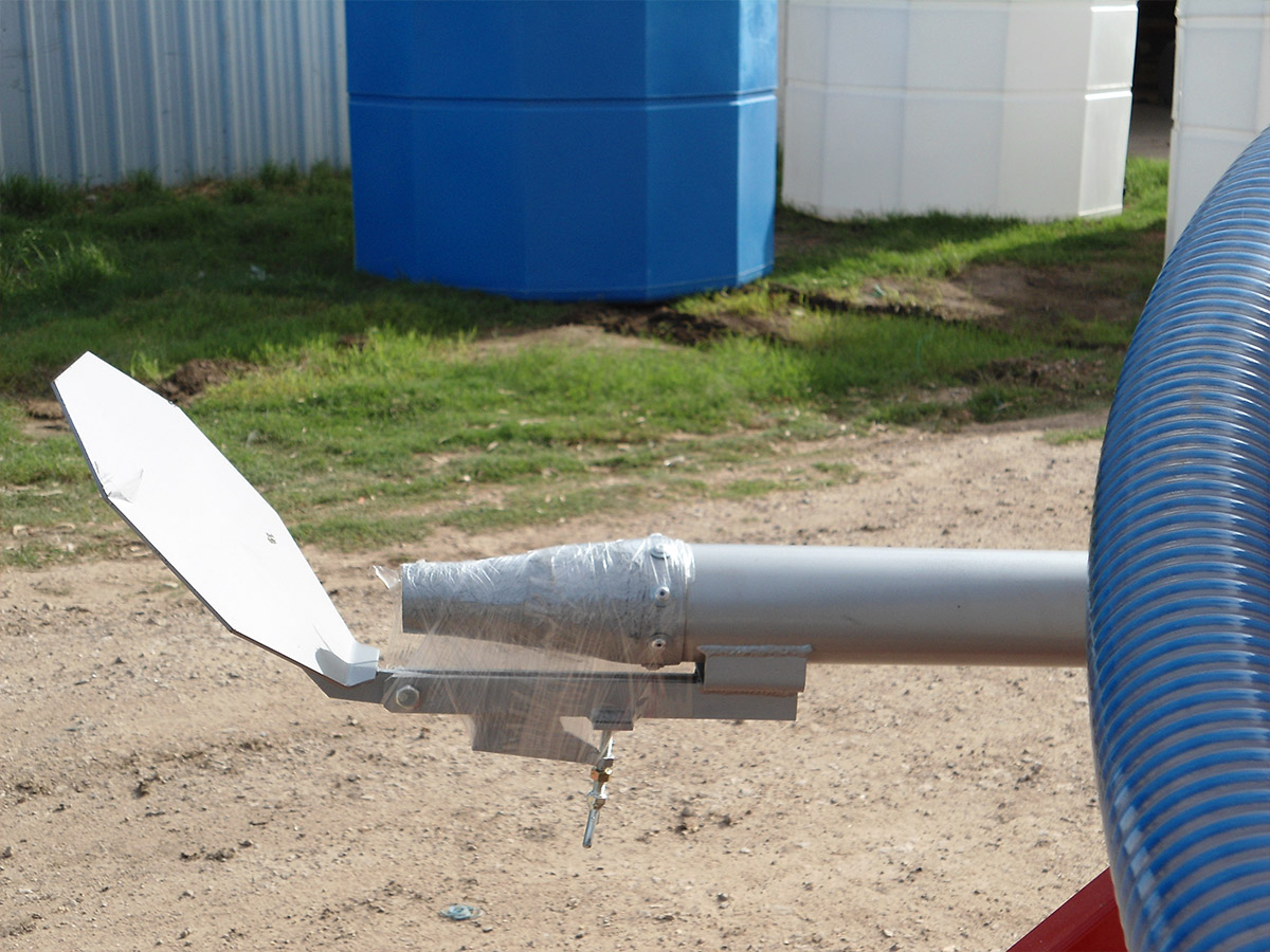 Las cañerías se resuelven con mangueras Heliflex de alta presión con acoples rápidos de 3″, lo que simplifica el montaje y el mantenimiento del circuito hidráulico. El pico de salida incorpora una paleta deflectora regulable que genera un abanico de esparcimiento de hasta 12 metros de ancho, logrando una distribución pareja del fertilizante orgánico sobre el suelo.