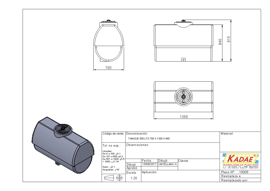 TANQUE 500 LTS. 700 X 1350 X 840
