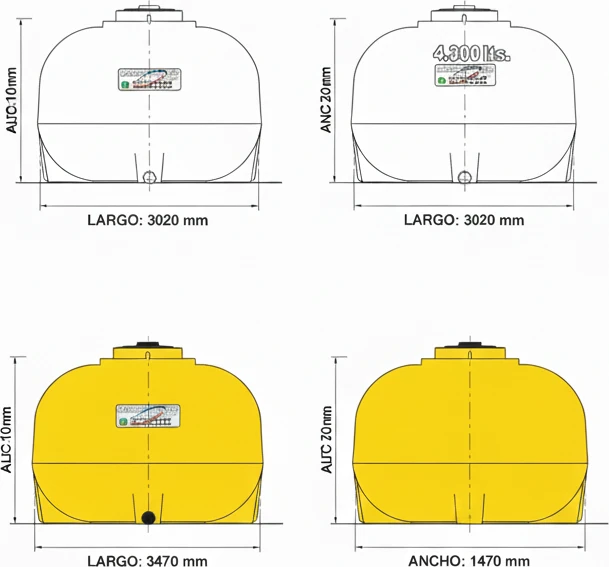 El Tanque horizontal de 4300 litros tiene una proporción perfectamente diseñada para un transporte seguro de liquidos o para un almacenaje adecuado en el intemperie. Su diseño le proporciona una firmeza y agarre capaz de soportar vientos fuertes y demas inclemencias.