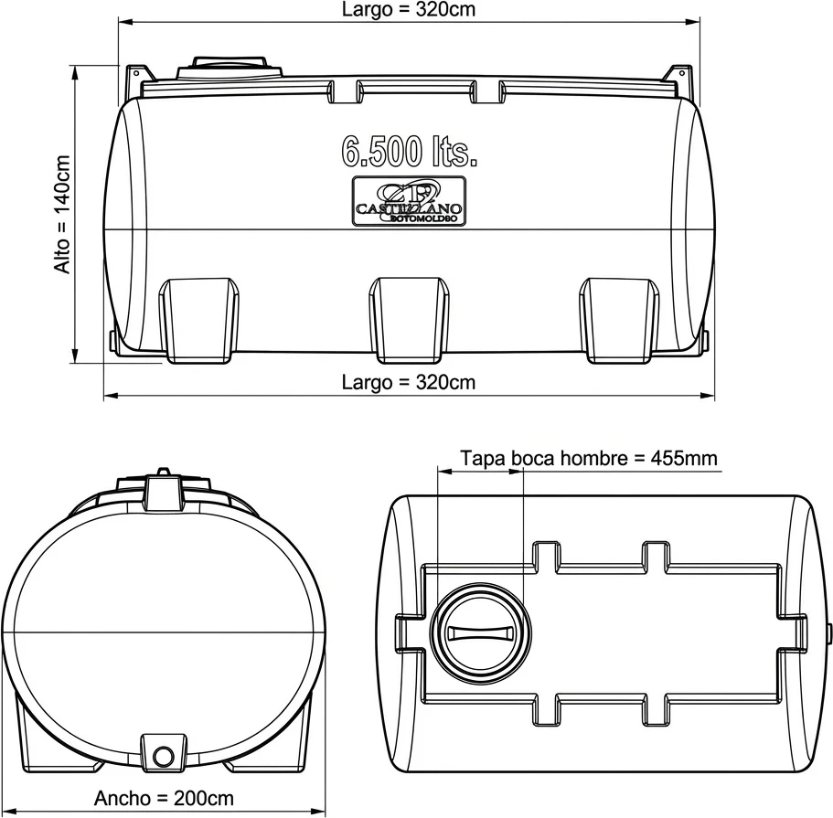 Las medidas del tanque son: Largo = 320cm Ancho = 215cm Alto = 180cm Peso = 300kg